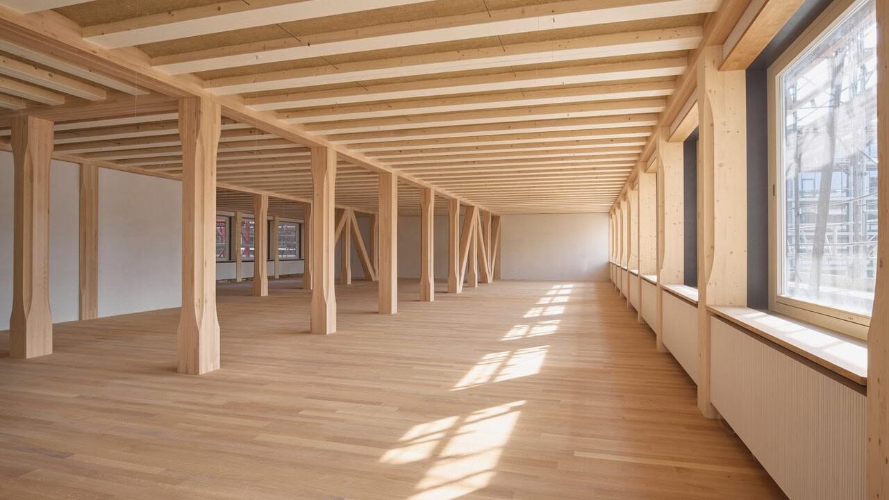 As a CO₂-intensive building material responsible for around 10% of global greenhouse gas emissions, concrete was omitted from HORTUS wherever possible. The only exception are the short piles driven into the groundm on which the building stands. Unlike a full basement, their carbon footprint is negligible. Instead of concrete, local materials such as timber, rammed earth, and recycled paper were used. The ceiling elements of HORTUS account for only about 7.5% of the building’s total CO₂ emissions. In comparison, a conventional reinforced concrete flat slab would contribute roughly three times as much (around 25% of total emissions).