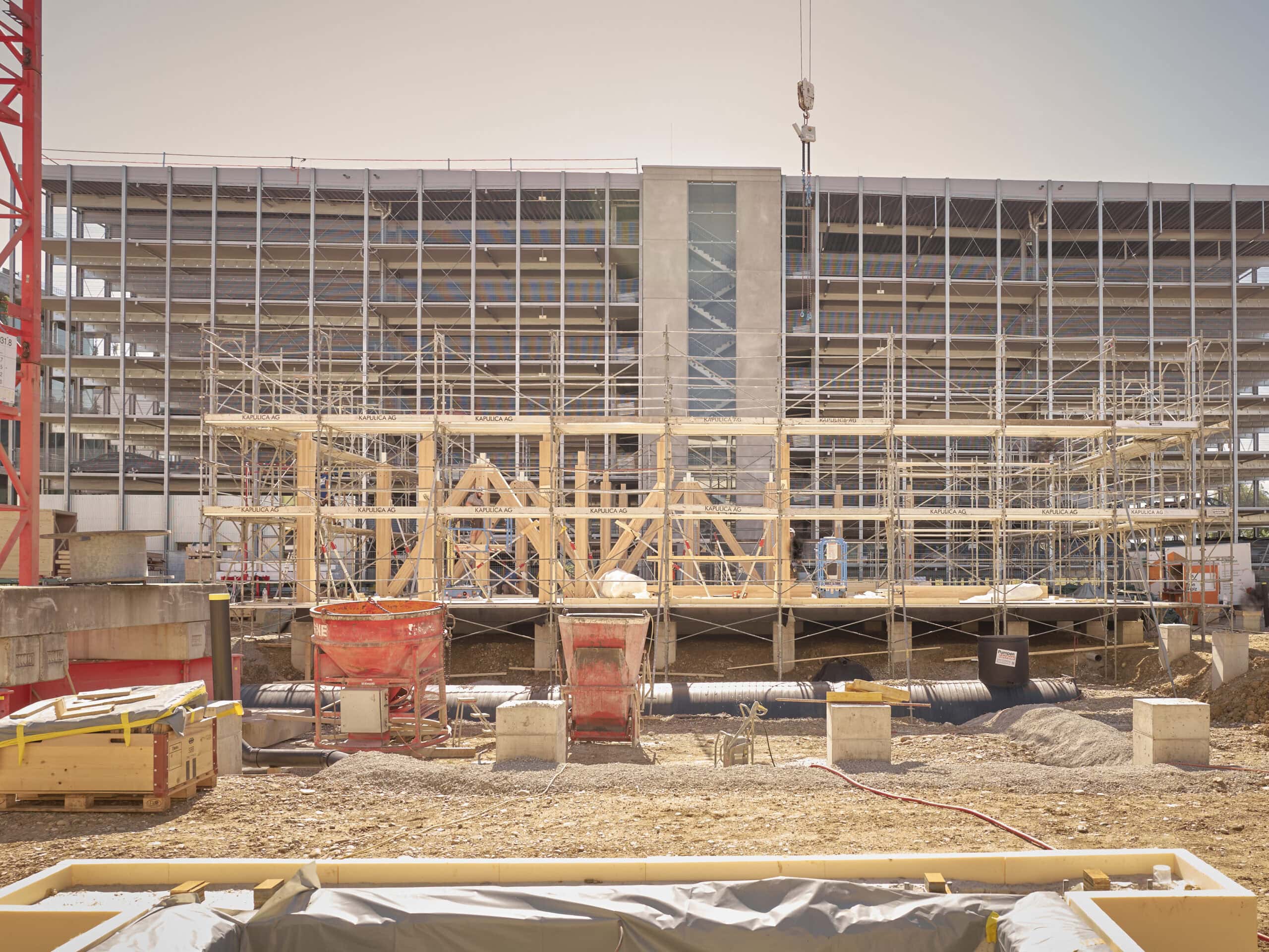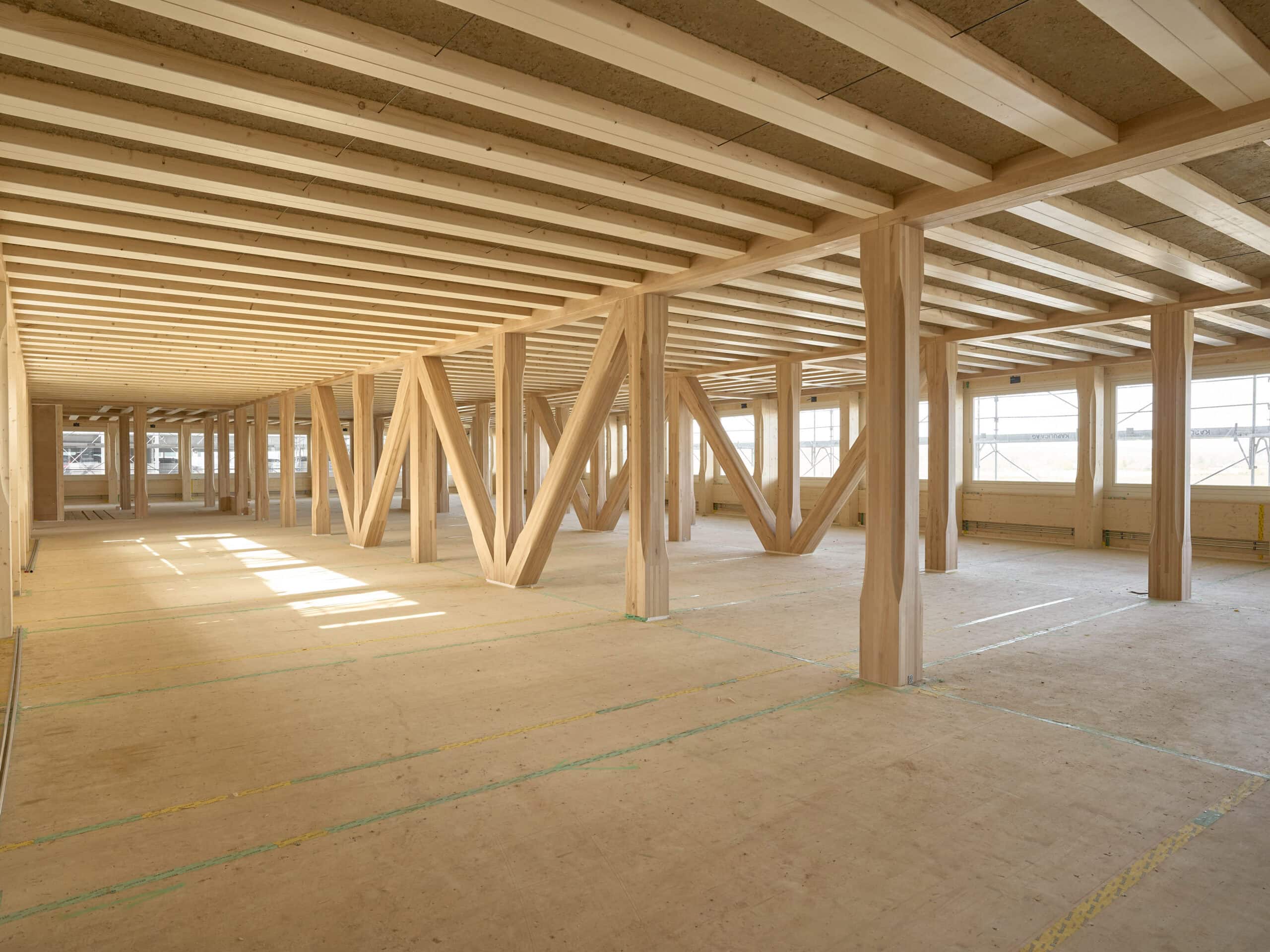 The vision was to create a building that would pay back its embodied non-renewable energy within a single generation and become energy-positive after 30 years. To achieve this radical sustainability goal and turn utopia into reality, interdisciplinary teams from SENN, Herzog & de Meuron, ZPF Ingenieure, Blumer Lehmann and the clay specialists at Lehm Ton Erde worked intensively together. Developing the innovative ceiling, made from timber and rammed earth, took around seven months before it met the ambitious requirements, including strict fire safety regulations.